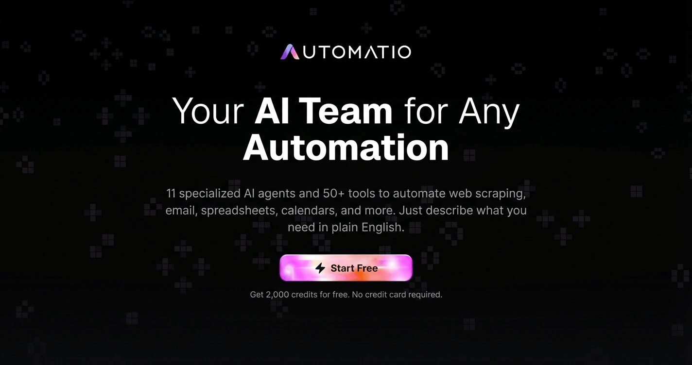 - ✓ og:description — 11 specialized AI agents and 50+ tools to automate web scraping, email, spreadsheets, calendars, and more. Just describe what you need in plain English.