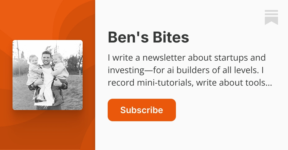 - ✓ og:description — I write a newsletter about startups and investing—for ai builders of all levels. I record mini-tutorials, write about tools I’m testing, share my insights and give you a peek behind the digital curtain from an exited founder turned investor. Click to read Ben's Bites, a Substack publication with hundreds of thousands of subscribers.