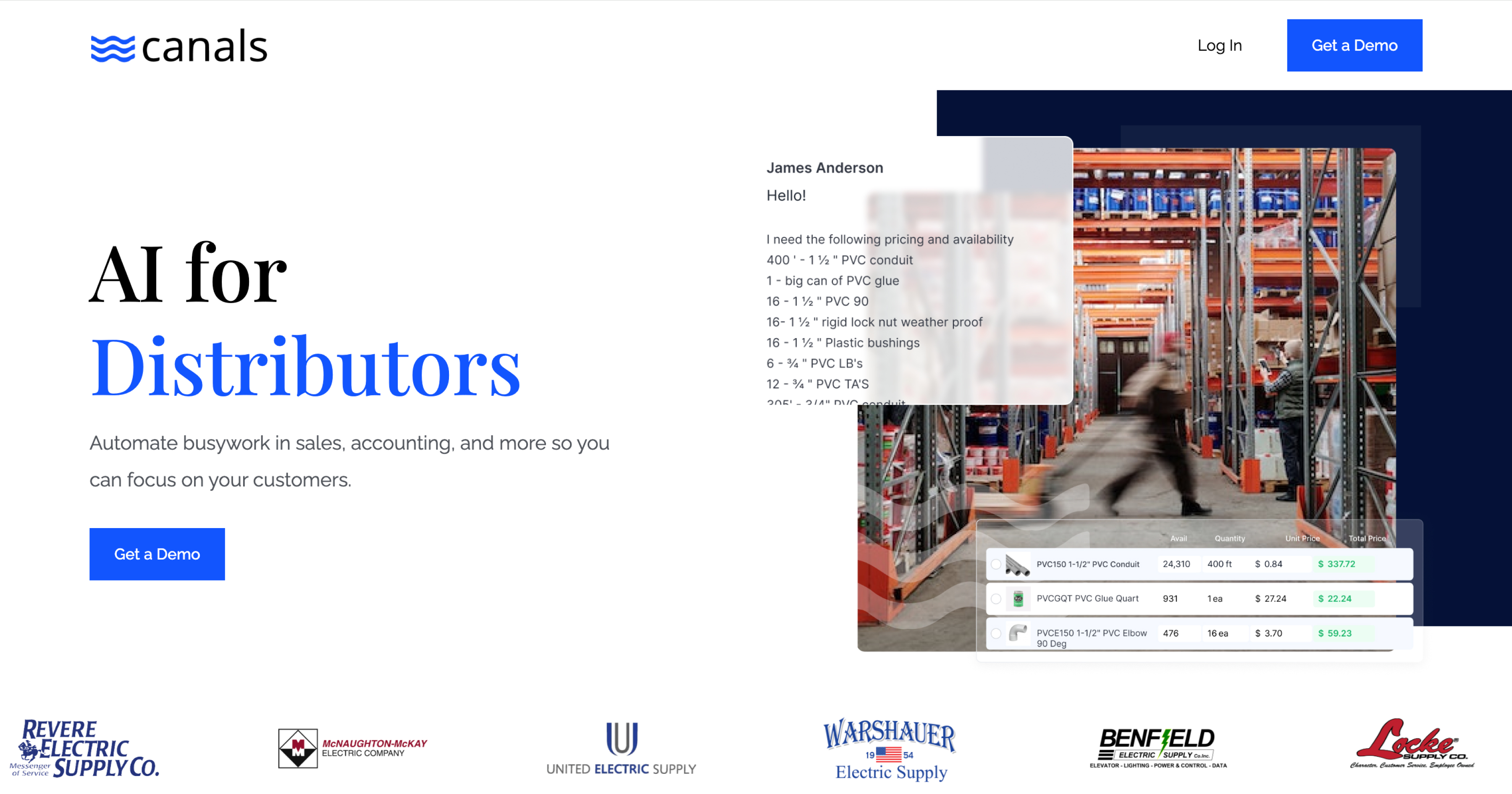 - ✓ og:description — See what's possible when you automate the busywork in sales, accounting, purchasing, receiving & more. Canals is trusted by distributors like United Electric, The Kendall Group, and many others.