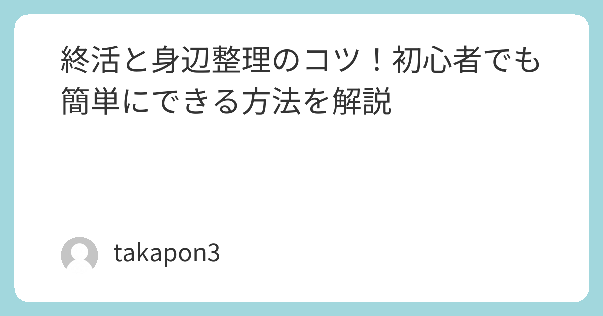 - ✓ og:description — 終活で身辺整理を始めたいけれど何から手をつければいいか分からない方に向けて、初心者でも簡単にできる方法とコツを解説します。効率的な進め方を知って、安心できる準備を始めましょう。