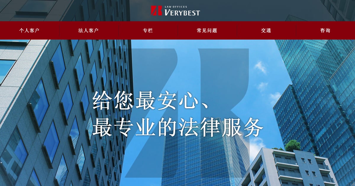 - ✓ og:description — Verybest法律事务所是日本拥有最多分支机构的大型律师事务所。中国律师与日本律师密切合作,提供刑事案件、离婚、继承等个人事务的解决方案,并处理中日之间的企业纠纷、合同审查、业务拓展支持等企业法律事务。