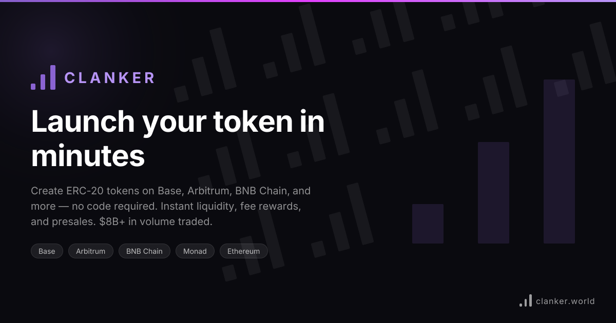 - ✓ og:description — Create and launch ERC-20 tokens on Base, Arbitrum, BNB Chain, and more — no code required. Instant liquidity, built-in fee rewards, and presales. Over $8B+ in trading volume. Start deploying today.