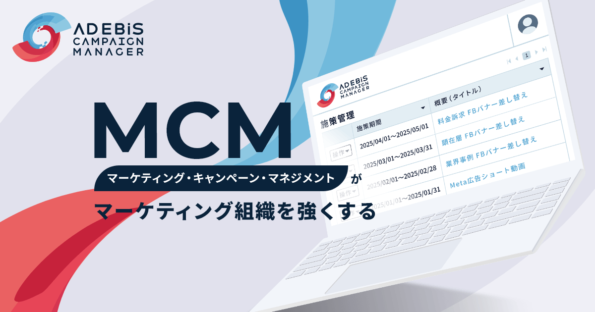 - ✓ og:description — MCM(マーケティング・キャンペーン・マネジメント)はマーケティング活動をナレッジとして蓄積・再利用し、マーケティング組織の能力を向上させます。AD EBiS Campaign ManagerはMCMプロセスを組織に定着させる仕組みを提供します。