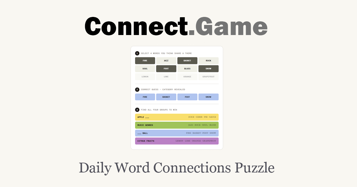 - ✓ og:description — Play a daily word connections puzzle online. Group related words, test your logic, and enjoy a fun brain game for free on Connect.Game.