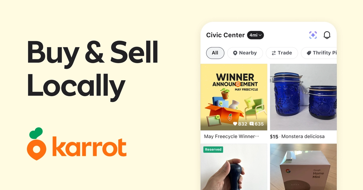 - ✓ og:description — Karrot is the largest local community marketplace to buy, sell and trade new and used home decor, furniture, fashion and more. Join our growing community of over 10 million verified users!