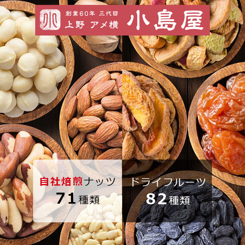 - ✓ og:description — ナッツとドライフルーツ専門店 小島屋公式【自社焙煎ナッツ71種類・ドライフルーツ82種類】無添加無油のアーモンドやくるみ、Bar御用達ミックスナッツをはじめ、人気のドライフルーツ、おつまみ珍味など豊富に取り揃え。上野・アメ横にて創業60年の卸小売り。