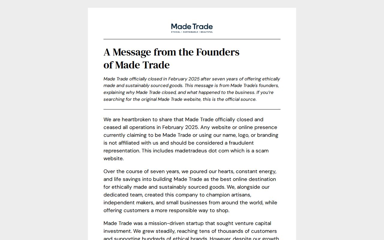 - ✓ og:description — Official message from the founders of Made Trade. Learn why Made Trade closed in 2025, what led to the shutdown, and how to avoid fraudulent websites using Made Trade's name and branding.