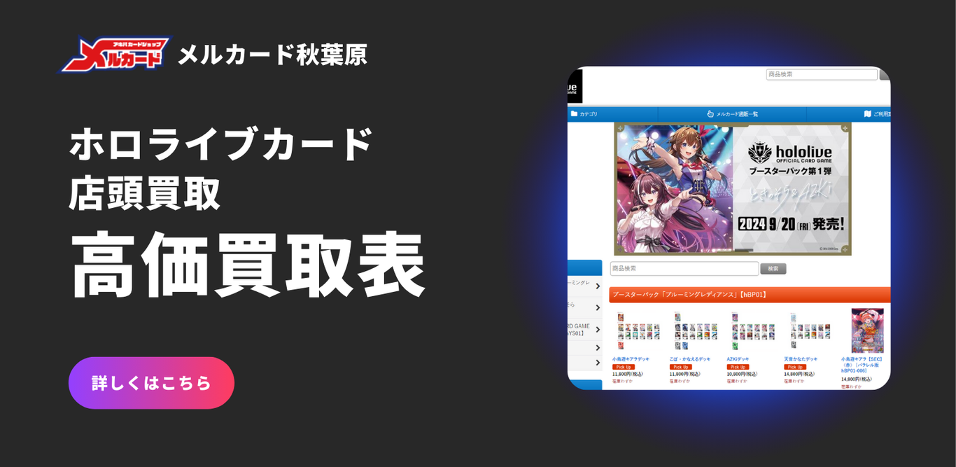 - ✓ og:description — hololive カードの通販はメルカード。ホロカ専用で取り扱っております。秋葉原に実店舗がありますので安心です。 ホロライブカード買取も承っております。