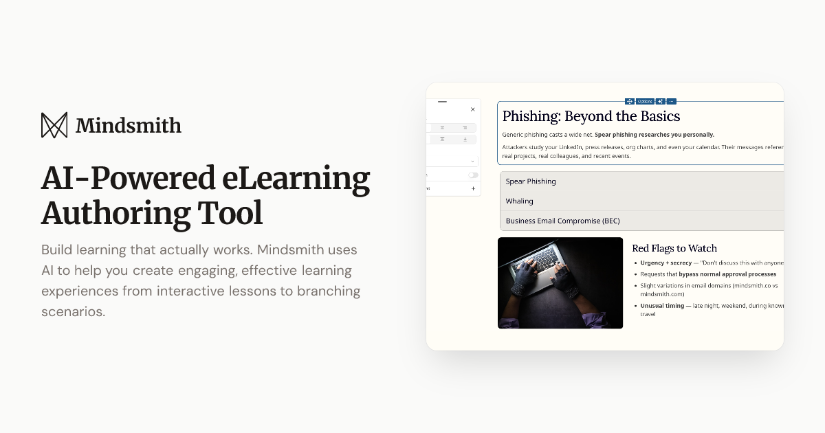 - ✓ og:description — Build learning that actually works. Mindsmith uses AI to help you create engaging, effective learning experiences from interactive lessons to branching scenarios.