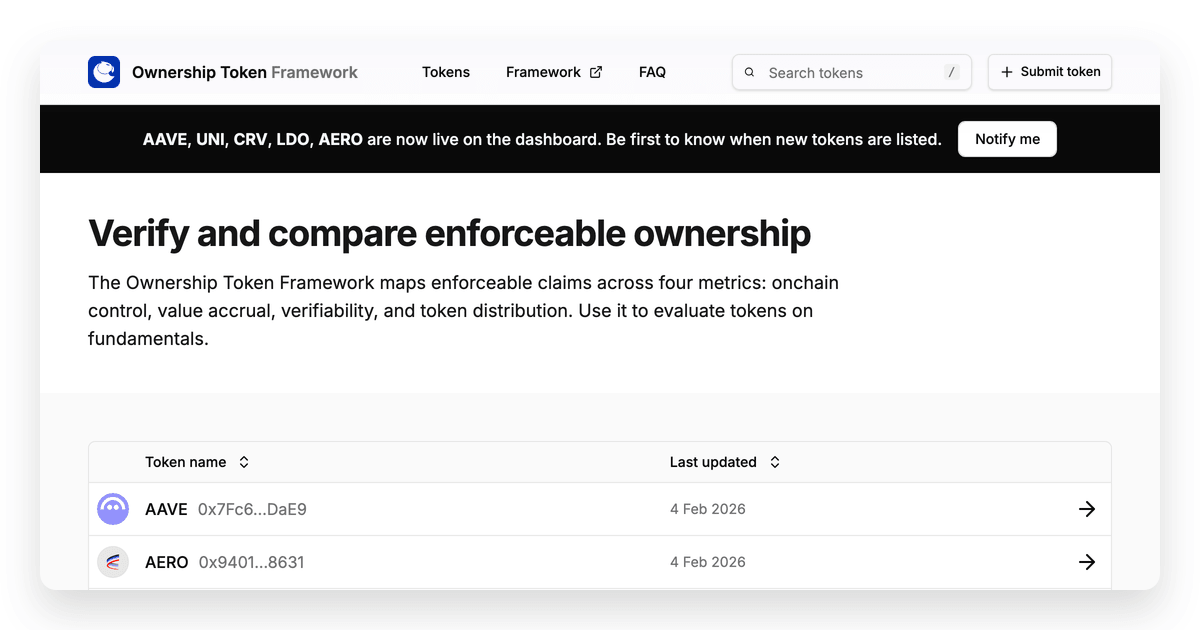 • ✓ og:description — The Ownership Token Framework maps enforceable claims across four metrics: onchain control, value accrual, verifiability, and token distribution. Use it to evaluate tokens on fundamentals.