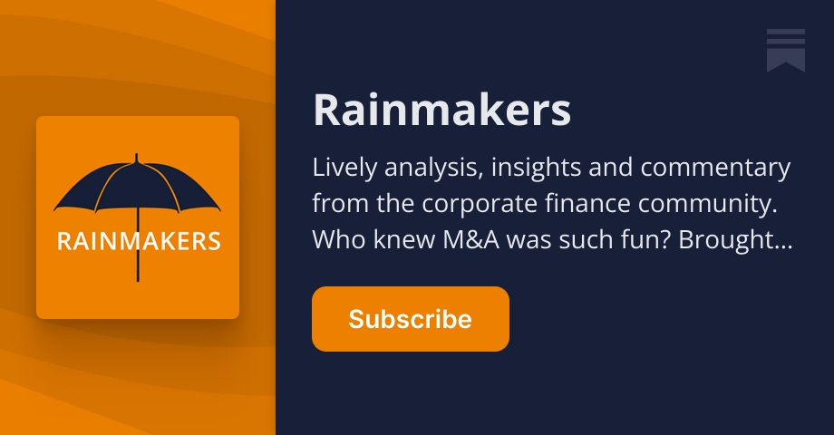 - ✓ og:description — Lively analysis, insights and commentary from the corporate finance community. Who knew M&A was such fun? Brought to you by TheBusinessDesk.com. Get in touch at rainmakers@thebusinessdesk.com. Click to read Rainmakers, a Substack publication with thousands of subscribers.