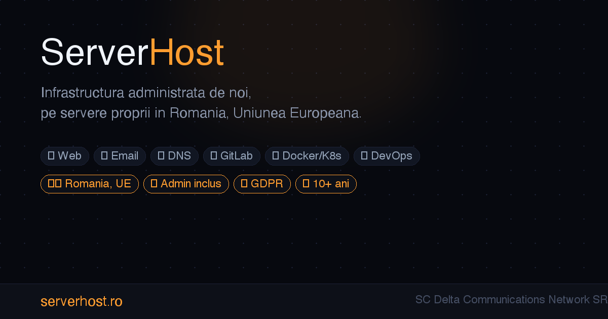 - ✓ og:description — Gazduire web, email, Docker, GitLab si Kubernetes administrate de noi, pe infrastructura proprie in Romania, UE. SSL, backup, monitorizare 24/7. De la 200 lei/luna.