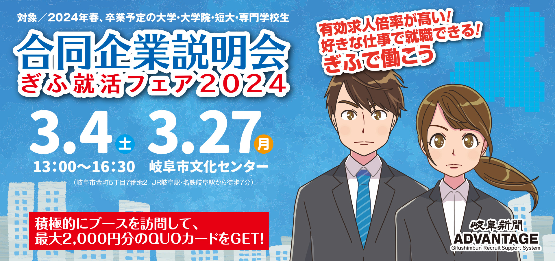 - ✓ og:description — 岐阜新聞ADVANTAGEは、地元・岐阜の企業が集まる合同企業説明会を随時開催しています。面接や選考の場ではなく、企業の担当者と直接会話するなかで情報収集を行ってもらう場です。岐阜県で就職を考える大学生・大学院生・短大生・専門学校生の方はぜひご参加ください。