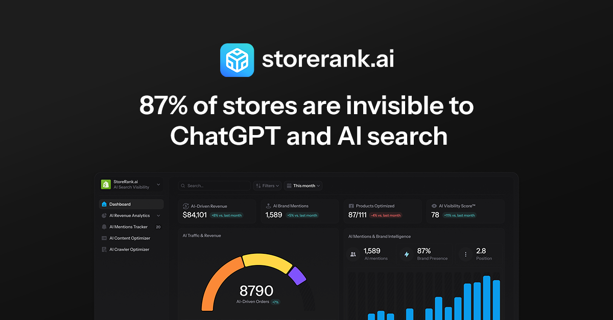 - ✓ og:description — Make your Shopify store visible in ChatGPT, Claude, and Perplexity. StoreRank.ai adds structured data, optimizes product content, and gets you discovered by AI — automatically. Start free today.
