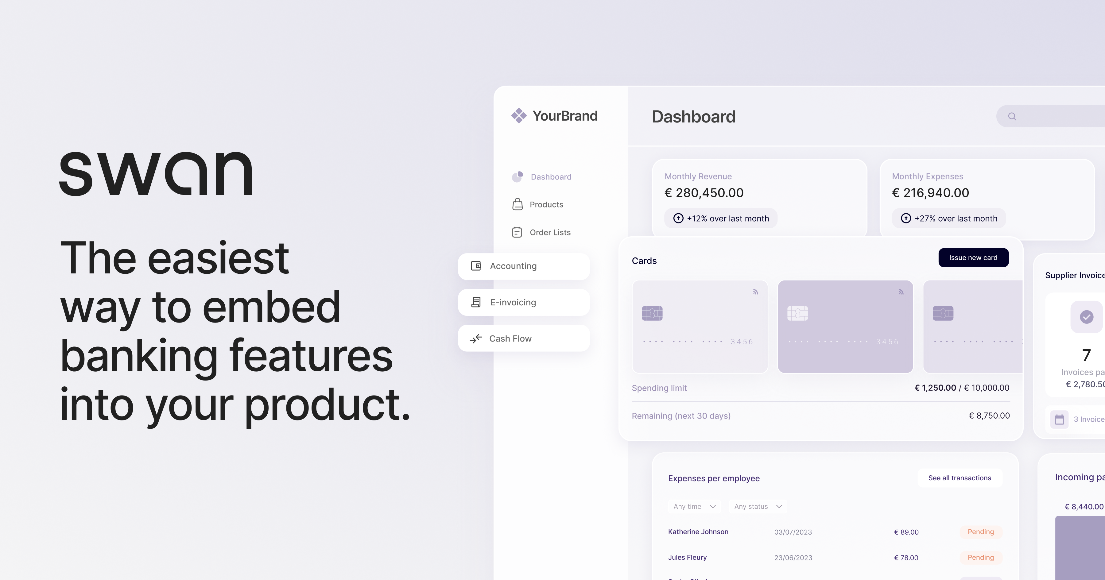 - ✓ og:description — Use Swan's APIs and ready-made white-label interfaces to embed banking features like accounts, cards, and payments into your workflows and UX.