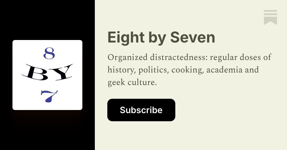 - ✓ og:description — Organized distractedness: regular doses of history, politics, cooking, academia and geek culture. Click to read Eight by Seven, by Timothy Burke, a Substack publication with thousands of subscribers.