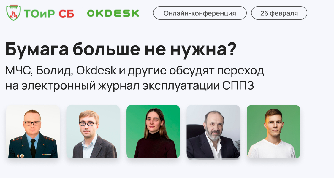 - ✓ og:description — Крупнейшая онлайн-конференция, посвящённая вопросам ТОиР систем безопасности. При участии МЧС, Болид, НПО Бастион и других. ТОиР СБ 2026 — Okdesk.