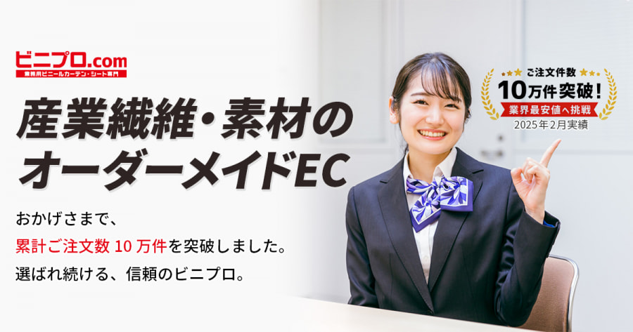 - ✓ og:description — 倉庫・工場・店舗などの業務用ビニールカーテン・シート・ネット(網)のオーダーメイド製作・販売のビニプロ。糸入り・透明ビニール、防炎・不燃シート、間仕切りシート、ネット(網)などを卸値価格でサイズオーダー・特注製作!ビニールカーテン用レールなども激安価格。