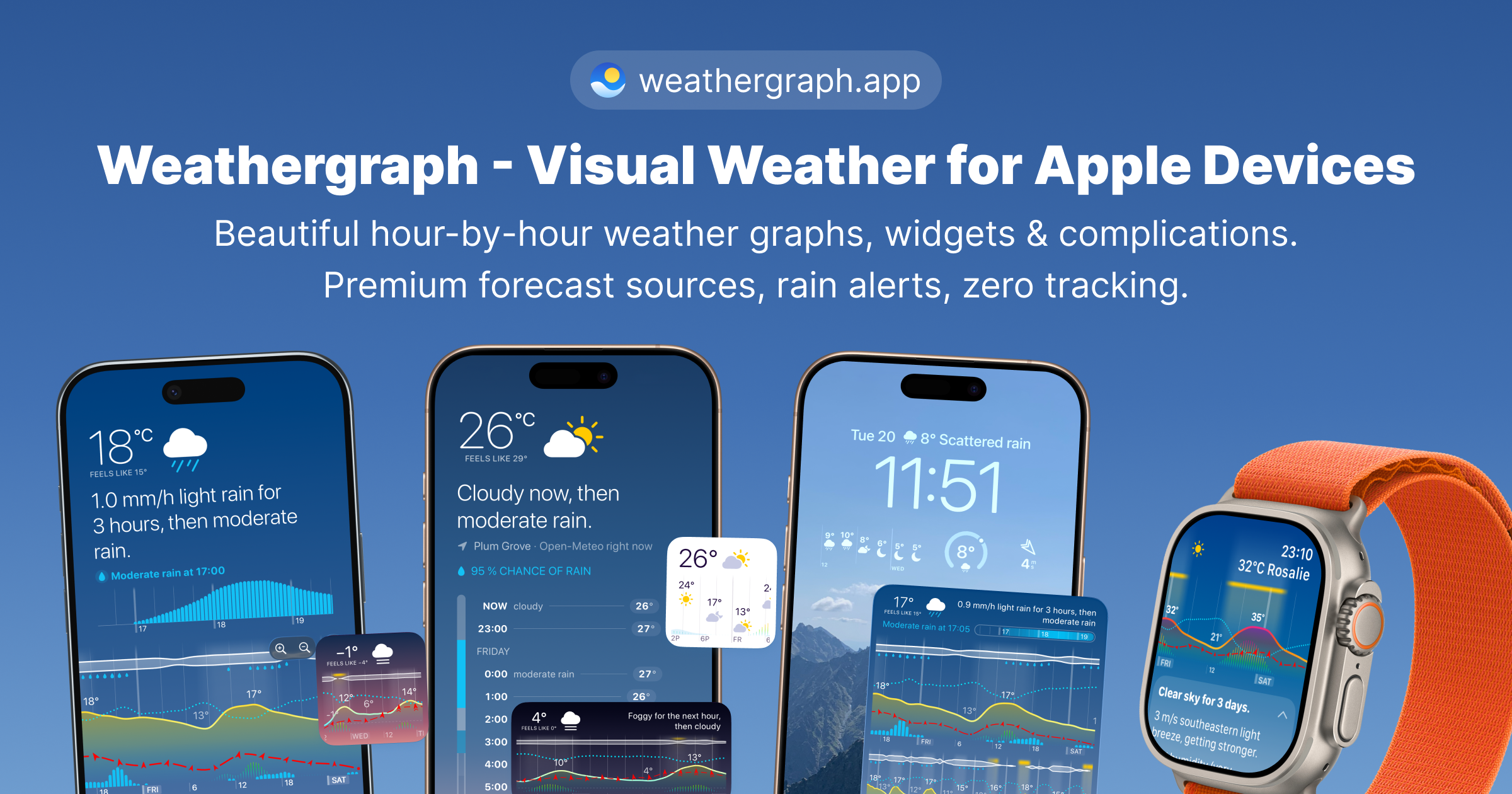 - ✓ og:description — Beautiful hour-by-hour weather graphs, widgets & complications. Premium forecast sources, rain alerts, zero tracking.