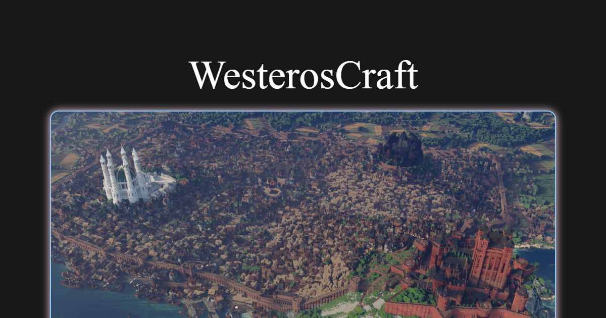 - ✓ og:description — Explore WesterosCraft, a meticulously crafted virtual realm inspired by George R.R. Martin's epic fantasy world. From King's Landing to Winterfell, our immersive Minecraft server offers a stunning, player-driven recreation of the Seven Kingdoms.